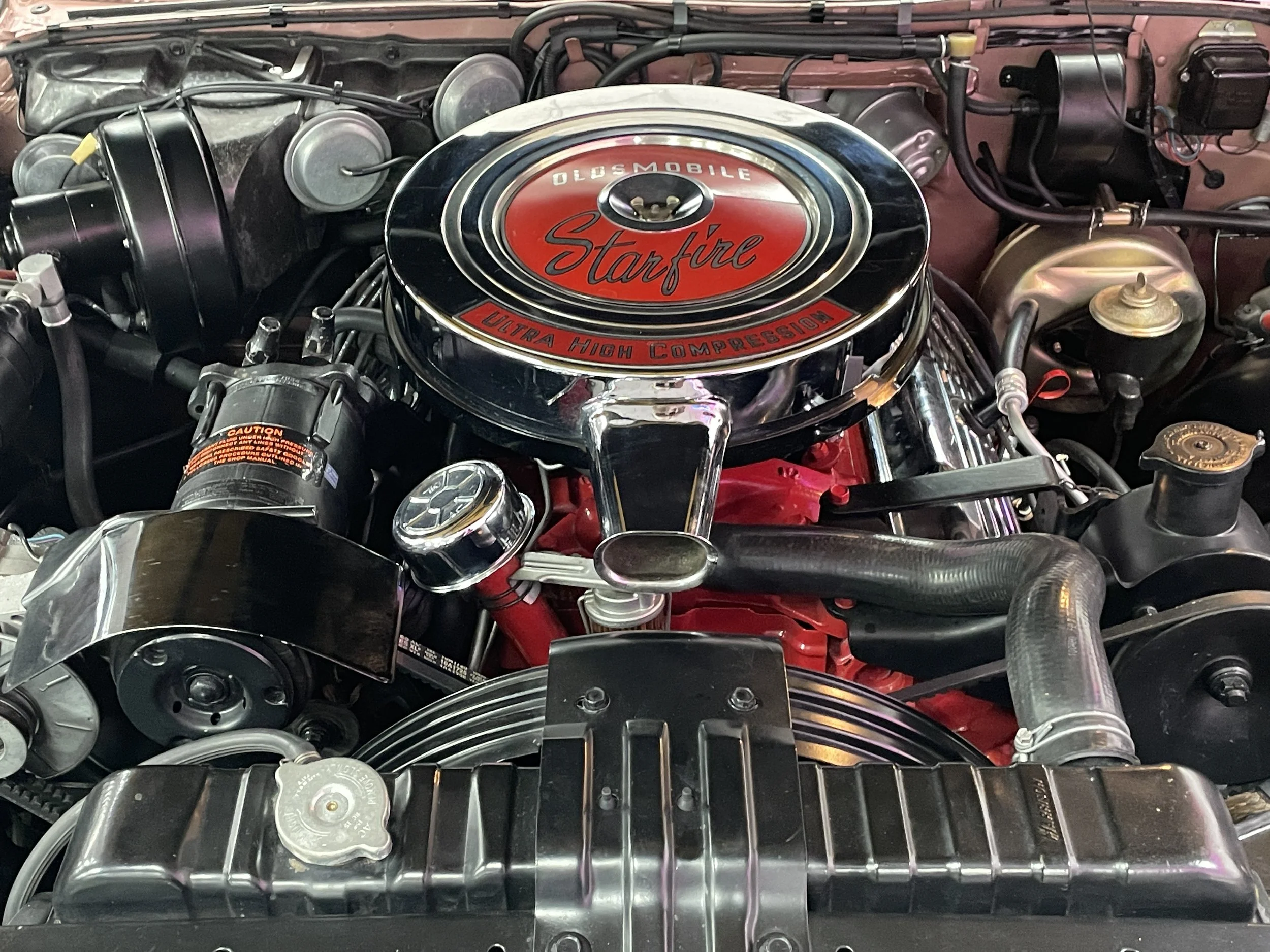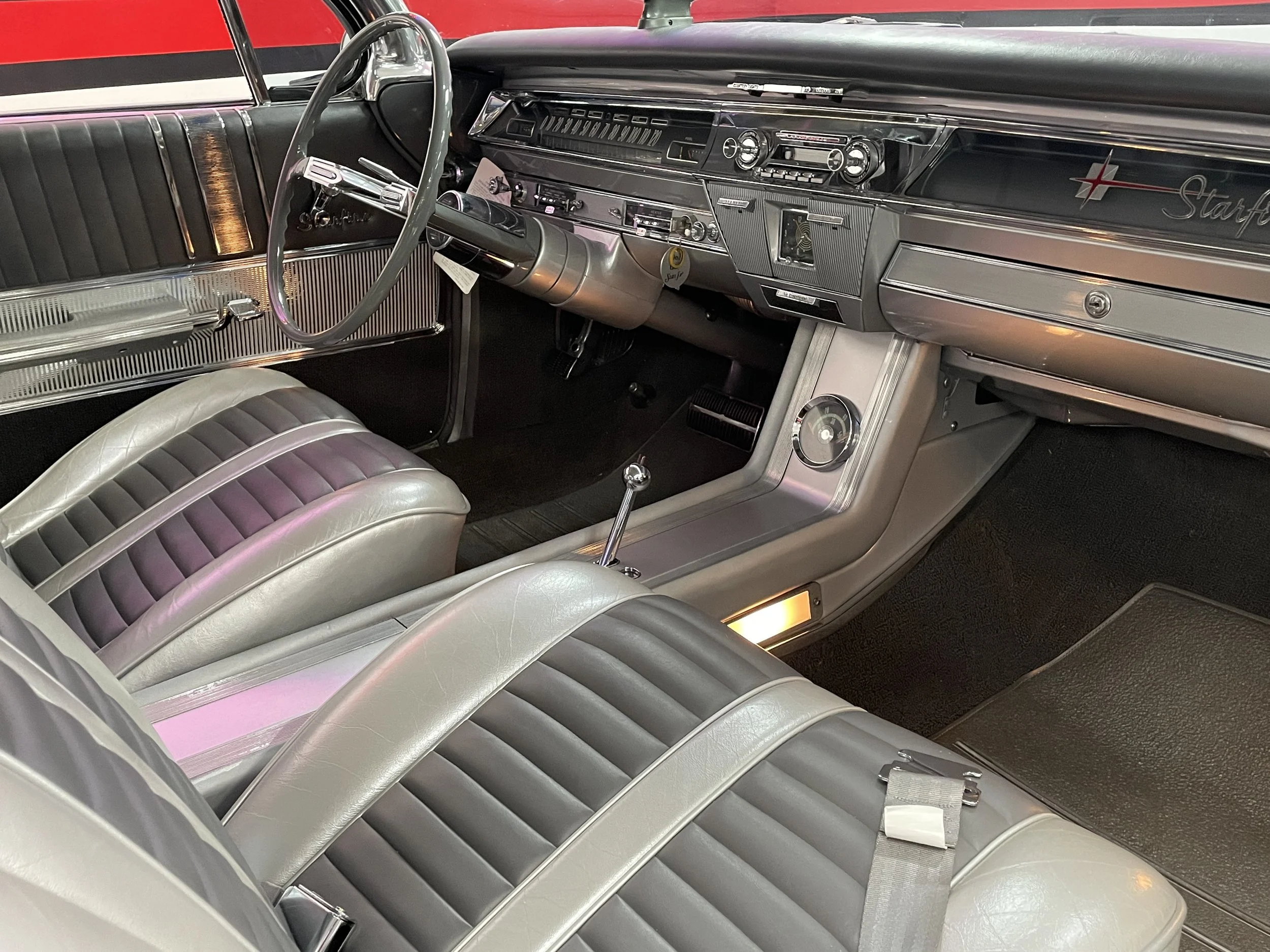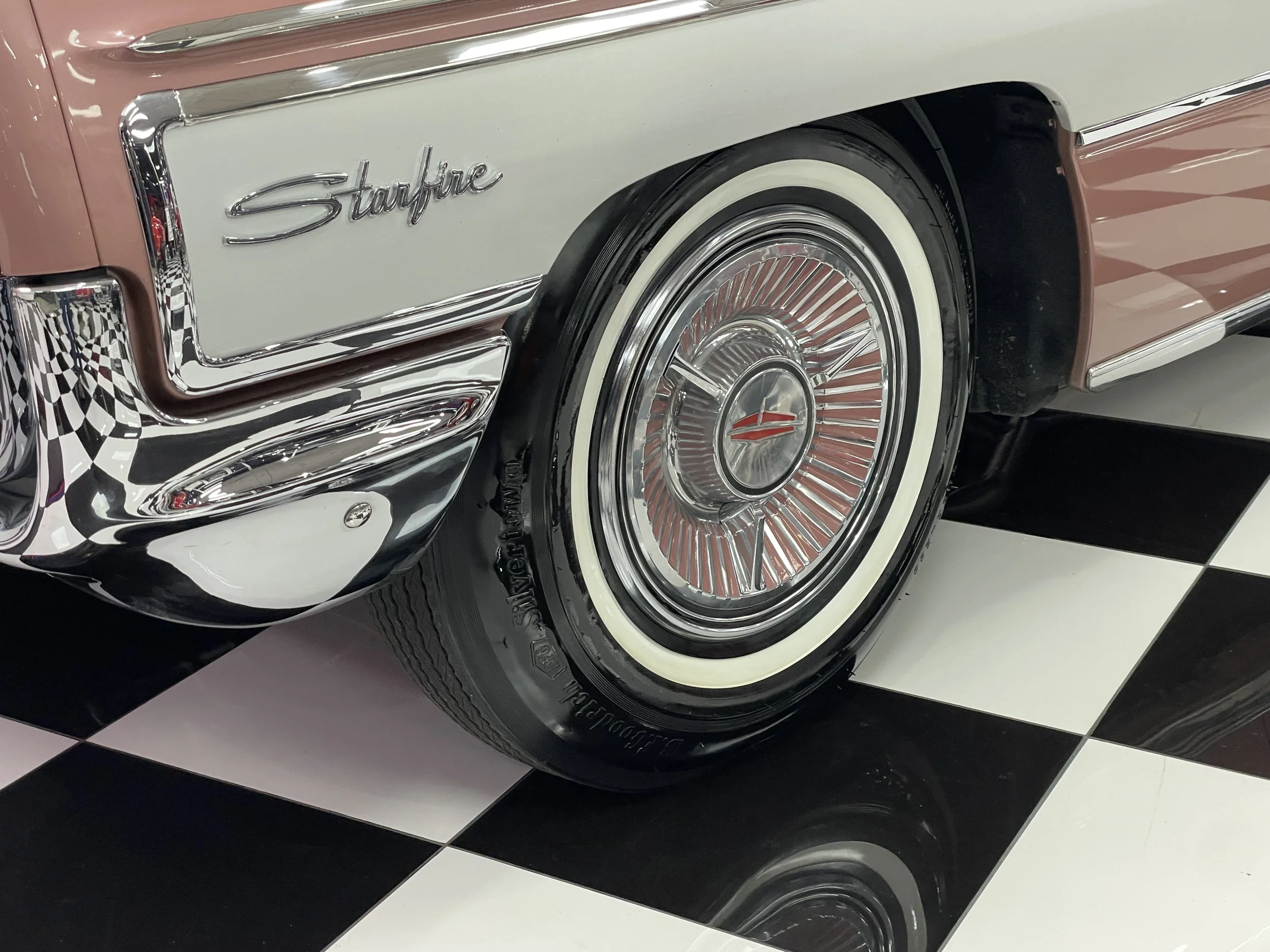 Frame-off restored to show quality condition. Comes with a photo album documenting the restoration process as well as numerous dealer brochures and the original Protect-O-Plate. The 62 Starfire is powered by a 394ci. V/8 delivering a factory rated 345 horsepower at an ultra-high 10.50-to-1 compression ratio and teamed with Oldsmobile’s Hydra-Matic Drive automatic transmission. The design elements of the Starfire are significant and “space-age” for the era. The Sunset Mist color is striking and a great compliment to all the chrome and stainless trim. Features include power steering and brakes, power windows, power leather bucket seats, console, tachometer, Wonder Bar radio, aluminum accented carpet inserts, dual exhaust, color matched luggage compartment, wide whitewall tires, factory air conditioning. The Starfire caused a sensation in the market from the moment it was first introduced! Here is your chance to own the best!