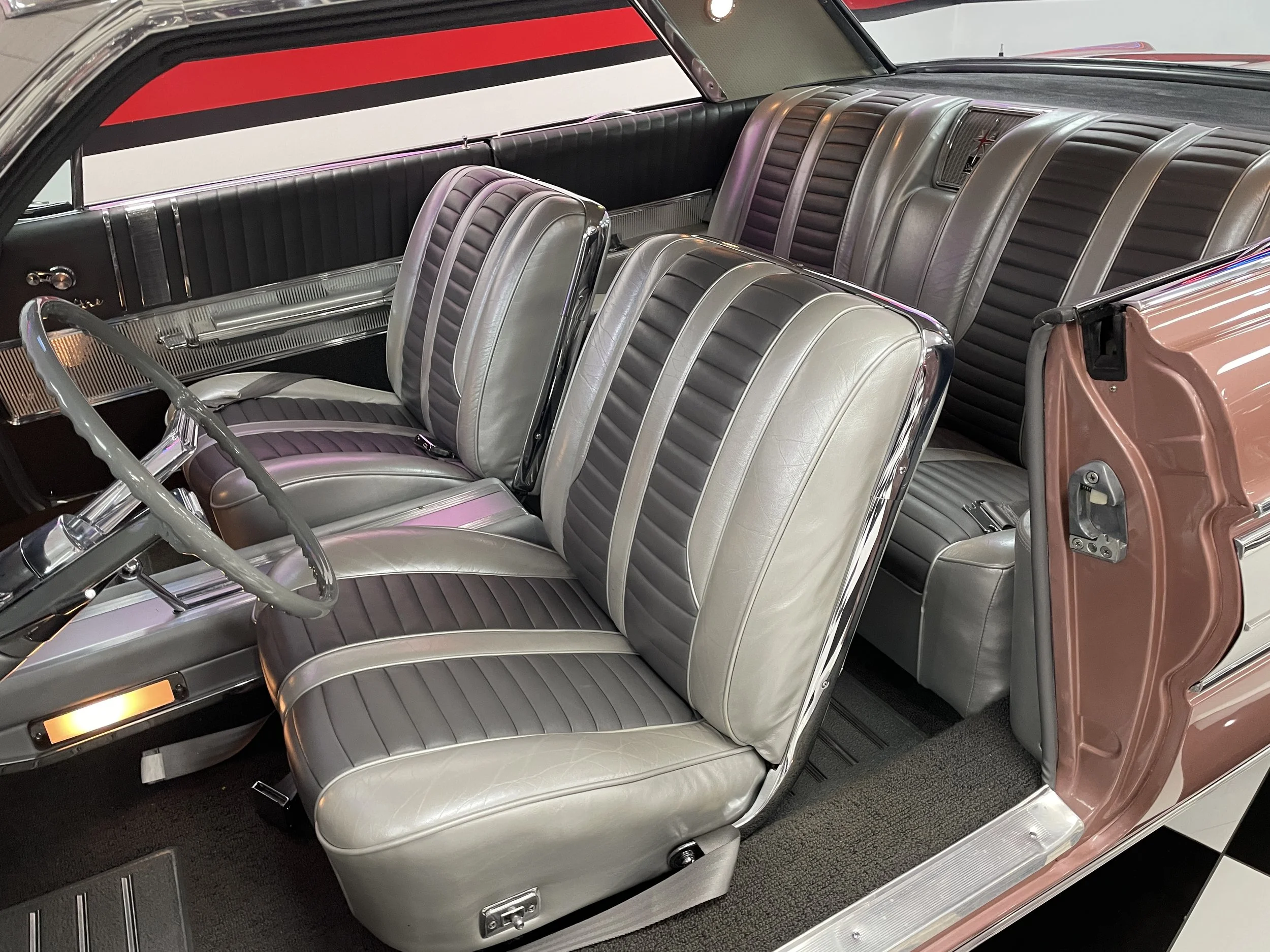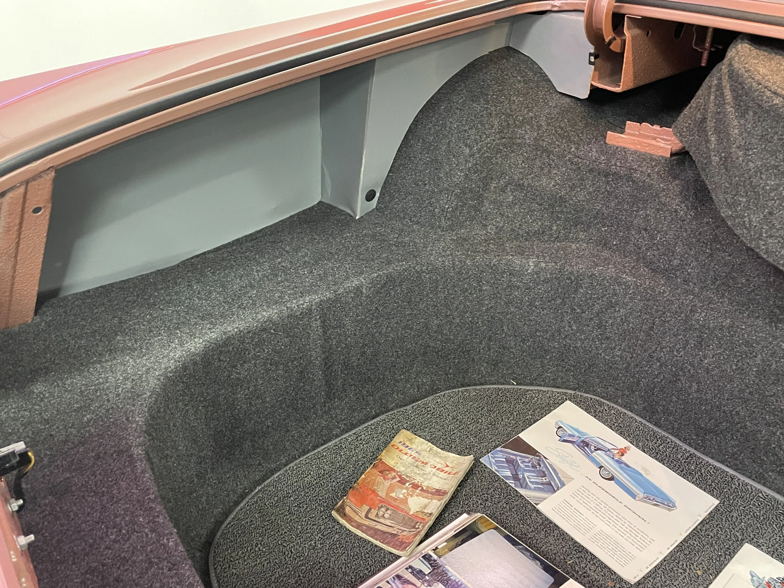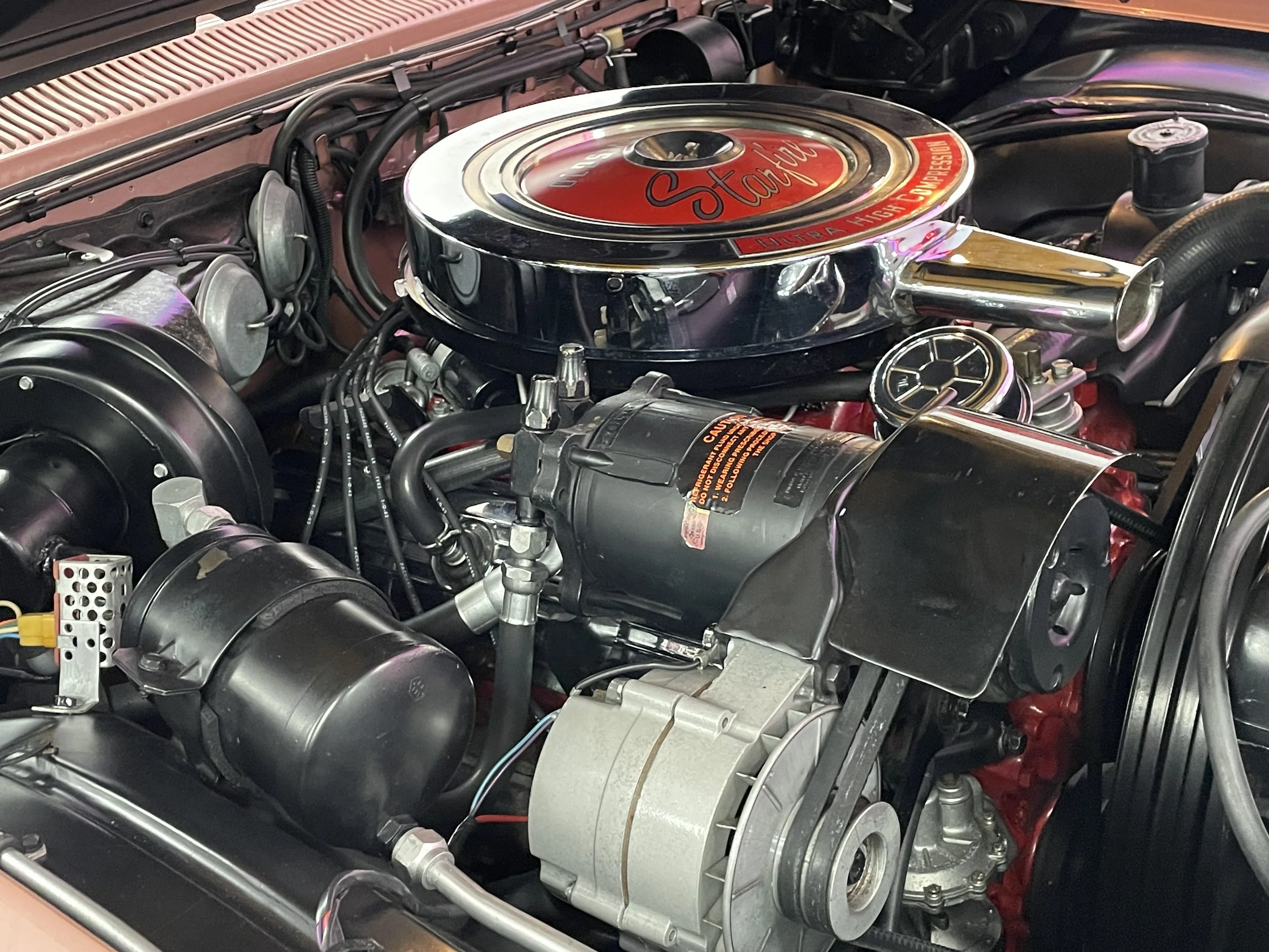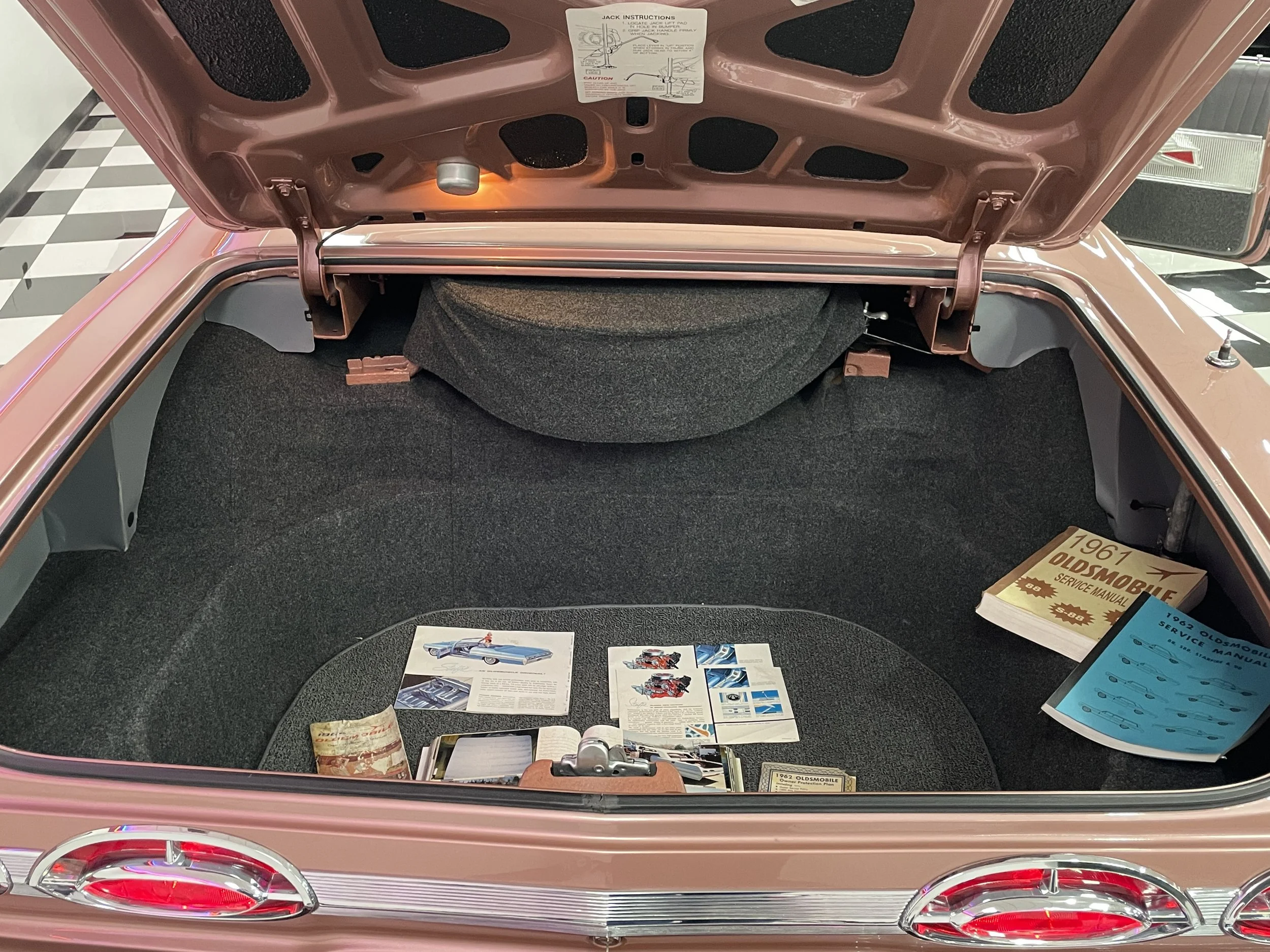 Frame-off restored to show quality condition. Comes with a photo album documenting the restoration process as well as numerous dealer brochures and the original Protect-O-Plate. The 62 Starfire is powered by a 394ci. V/8 delivering a factory rated 345 horsepower at an ultra-high 10.50-to-1 compression ratio and teamed with Oldsmobile’s Hydra-Matic Drive automatic transmission. The design elements of the Starfire are significant and “space-age” for the era. The Sunset Mist color is striking and a great compliment to all the chrome and stainless trim. Features include power steering and brakes, power windows, power leather bucket seats, console, tachometer, Wonder Bar radio, aluminum accented carpet inserts, dual exhaust, color matched luggage compartment, wide whitewall tires, factory air conditioning. The Starfire caused a sensation in the market from the moment it was first introduced! Here is your chance to own the best!