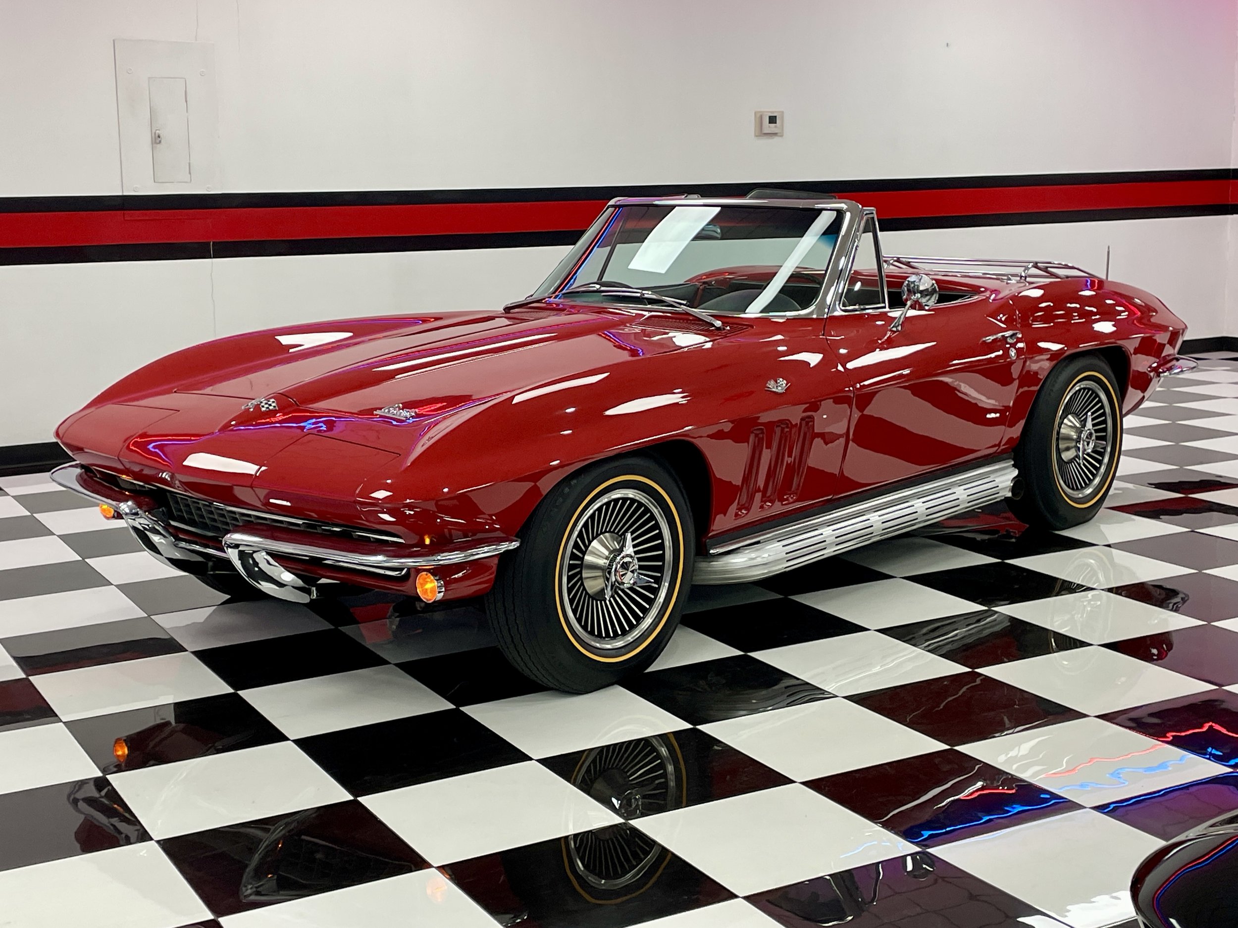 This gorgeous Vette has many attractive features including the original, numbers matching, 327ci./300hp. V/8 engine, 4-speed transmission, power brakes, knock-off wheels, gold line tires, power antenna, side exhaust, woodgrain steering wheel, both tops and a very rare luggage rack option. The car has had a recent professional detail and all of the mechanical operations are in great working order. This car is a blast to drive, sounds fantastic and runs as it should.