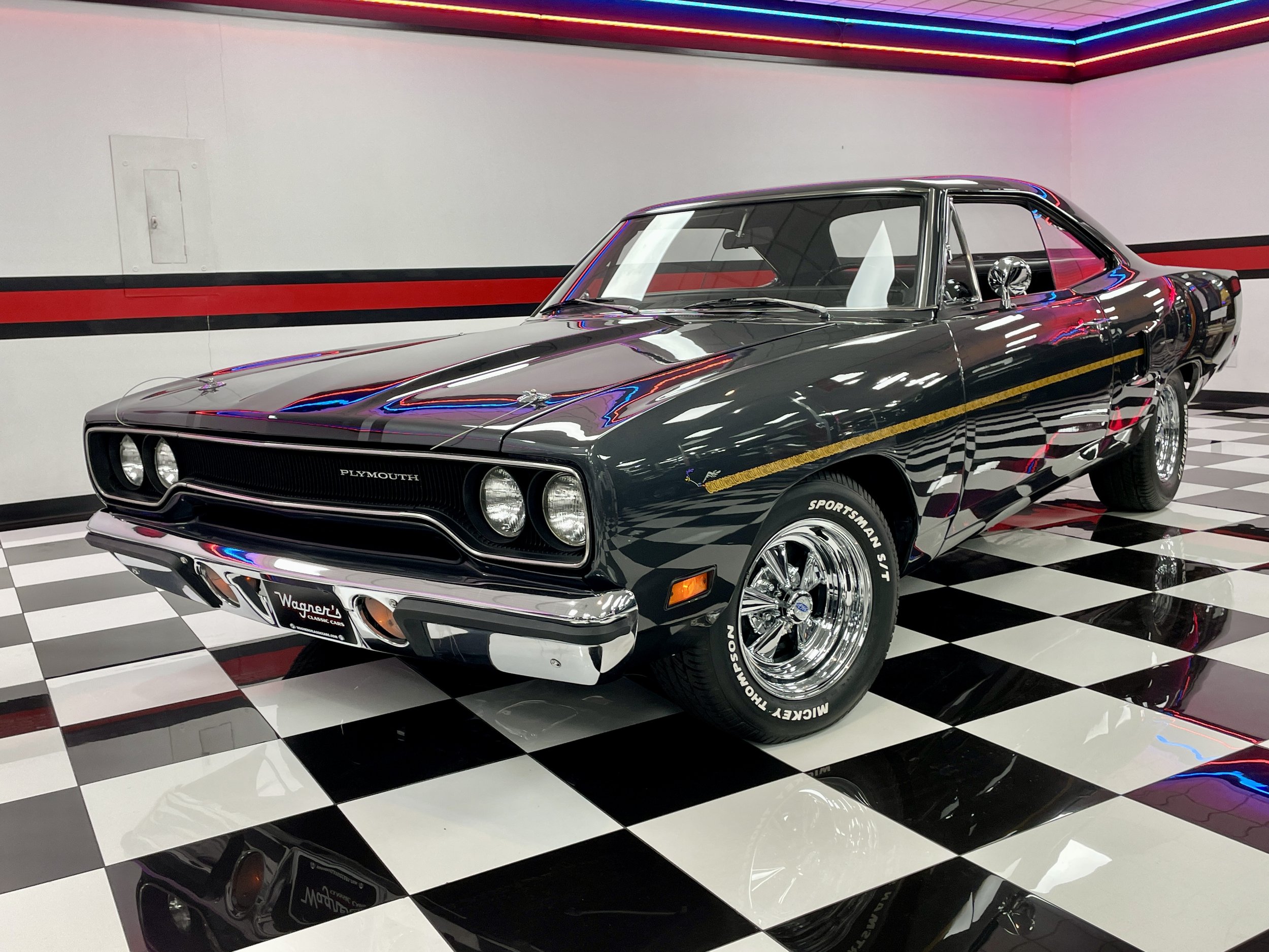 This classic looking Plymouth features a 383 Magnum V8 and a Pistol Grip 4-speed transmission and Heavy-Duty sure grip rear axle. Other features include the 150 MPH speedometer/Tach & clock. The old-school Cragar SS rims look period correct. A few other items of interest per the data plate showL31 hood mounted turn signals, M21 drip through molding, R11 music master radio, L8W transverse tape stripe, A01 light package, B51 power brakes, G31 manual control chrome pass mirror, G33 remote drivers mirror, J25 3-speed windshield wipers, E63 383 Magnum 335hp engine, D21 4-speed floor shifter, RM23 Road Runner hardtop 2dr. This car sounds great and really runs and drives as it should.